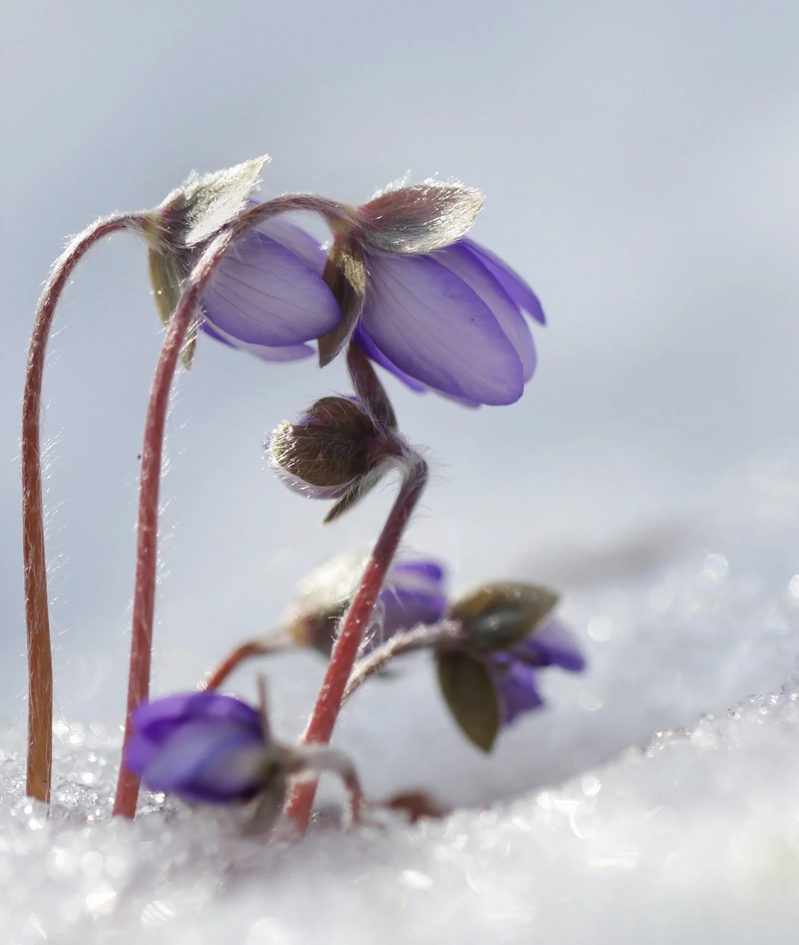 A group of Pulsatilla spp., with their solitary type flowers poking out of the snow.